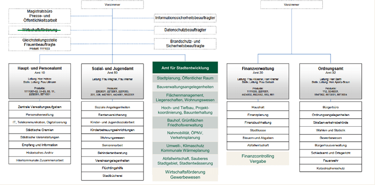 Im jetzigen Organigramm der Stadtverwaltung sind wichtige Aufgabenbereiche nicht aufgeführt. Dazu gehören die Kommunale Wärmeplanung, der Klima- und Umweltschutz, die Projektkoordinierung und Bauunterhaltung sowie die Nahmobilität.